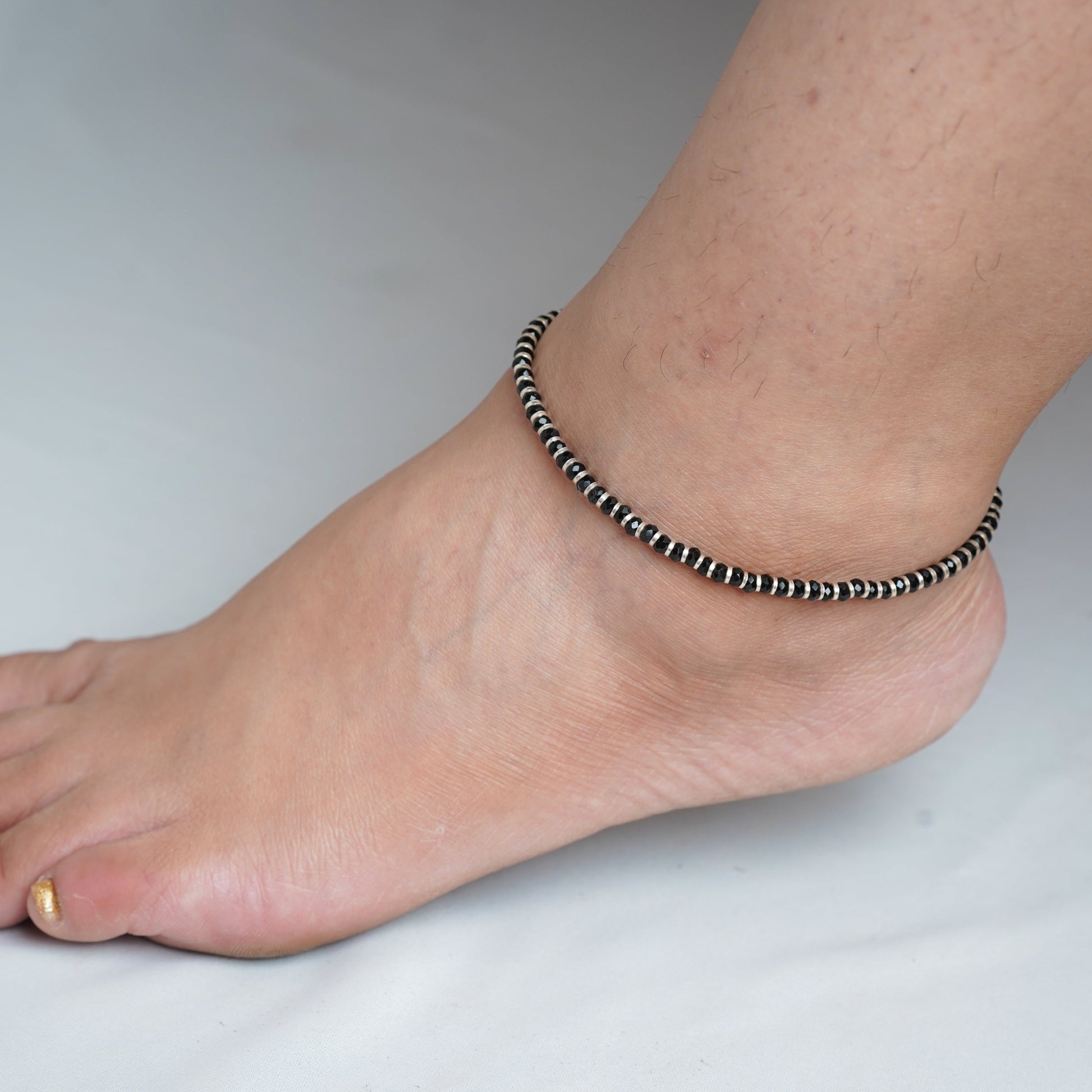 Minimal nazaria anklet crafted in 925 sterling silver with black beads and an adjustable fit. A refined everyday anklet designed for protection and elegance.